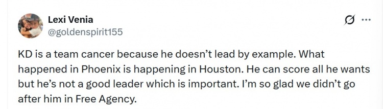 网友:杜兰特被认为是一个团队毒瘤,因为他没有以身作则。在菲尼克斯发生的事情现在也在休斯敦重演。他可以随心所欲地得分,但他不是一个好的领袖,而这一点非常重要。我很高兴我们在自由球员市场上没有追求他。
